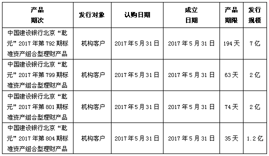 中国建设银行北京市分行定于2017年5月31日发行理财产品,现将相关发行情况公告如下: