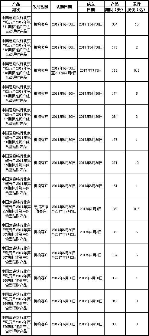 中国建设银行北京市分行定于2017年6月30日发行理财产品,现将相关发行情况公告如下: