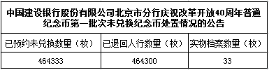 中国建设银行股份有限公司北京市分行庆祝改革开放40周年普通纪念币第一批次未兑换纪念币处置情况的公告