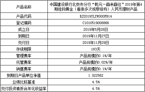 中国建设银行北京市分行“乾元—赢来赢往”2019年第4期挂钩黄金(看涨多次观察结构)人民币理财产品终止及清算公告
