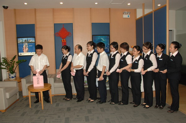 浙江分行: 在惊悉了四川强地震后,浙江省分行网点及时做好捐款客户引导工作,13日一早便设立“抗震救灾爱心款服务窗口”,为前来捐款的客户开通绿色通道,将全部通过建行网络汇入中国红十字基金会。 同时,该行员工迅速行动,纷纷伸出爱心之手,踊跃捐款,以实际行动支持灾区人民紧急救助,帮助受灾民众共渡难关。 河南分行: 四川地震灾害发生后,河南省分行迅速做出组织全行员工捐款活动的决定,全行员工积极行动,捐款数字不断攀升,短短一天时间内,募集捐款158.8万元。5月14日下午,河南省分行副行长石永拴代表全行员工将捐款交到河南省红十字会。 建行河南省分行员工向灾区第二次捐款。 河南省分行员工献血现场。 河南省新乡分行员工、家属纷纷加入捐款行列,孩子们也捧起了存钱罐踊跃捐款。 辽宁分行: 四川省汶川等地的地震灾情,深深地牵动着辽宁分行全体员工们的心。连日来,大家通过新闻媒体密切关注地震情况,与灾区人民的心紧紧相连。 灾害无情人有情,真情相牵,爱心无价。辽宁分行积极响应省行党委的号召,近400名员工立即行动起来,踊跃为地震灾区捐款。现场热烈而感人,充分体现了该行员工发扬“一方有难、八方支援”的精神。大家用实际行动,支援灾区人民度过难关,恢复生产,重建家园。 辽宁省鞍山站前支行储蓄专柜员工坚持加班,清点红十字协会每天收到的数十万元捐款。 广西分行: 汶川地震灾情发生后,广西分行党委高度重视,坚决贯彻落实总行党委关于抗震救灾的有关指示外,号召全行员工积极捐款,支援灾区。5月14日上午,该行负责人前往广西红十字会办理捐款手续,将员工首期捐款10万元转交四川地震灾区。 深圳分行: 灾情发生后,建行深圳分行即刻紧急启动“心系灾区、重建家园”抗震救灾爱心大行动,向全体员工发出倡议:呼吁各单位员工发扬“一方有难,八方支援”的团结互助精神,立即伸出双手为灾区人民抗震救灾,重建家园,献出建行员工的爱心。 通知得到全行员工的积极响应,各单位员工捐款捐物踊跃,部分老员工家庭十分困难,但表示为了灾区人民,一定要奉献上自己的一片爱心,为灾区人民重建家园,贡献自己的一份力量。据统计,该行截止5月15日上午10时员工共捐款约84万元,募捐活动目前还在进行中。 山东分行: 地震无情,建行有爱。5月12日下午四川汶川发生7.8级强烈地震后,建设银行山东省分行员工立即行动起来,踊跃自发地向灾区捐款。大家在做好本职工作的同时,及时了解灾区救灾情况,伸出援助之手,奉献拳拳爱心。截止15日下午,山东省分行各级分支机构员工已捐款达120多万元。 山东省分行慰问省公安消防总队赴川抗震救灾官兵的家属。 陕西分行: 受四川省汶川县地震的波及,陕西省宝鸡分行所在地区震感强烈,部分办公设施遭到了损毁。面对突如其来的地震灾害,宝鸡分行积极应对,在保证人员、资金的安全的前提下,坚持开展各项金融服务。图为在地震发生的危险时刻,在撤离前,员工们首先采取措施保证资金安全。 地震发生后,汉中分行采取弹性排班等措施坚持营业。 陕西省分行组织员工赴宝成铁路109隧道抢修现场,慰问铁路建设者。 福建分行: 四川汶川发生7.8级地震后,福建省分行立即动员,广泛宣传,并于13日上午向全省分支机构发出了《震灾四川,赈灾有我》的捐款倡议书,号召全体员工发扬人道主义精神,慷慨解囊,帮助灾区人民渡过难关、重建家园。据统计,截至5月15日16:30,全辖员工累计捐款1436969.06元。 福建省福州城东支行储蓄专柜积极行动起来,按照总行部署,开通赈灾捐款绿色通道,并在该网点悬挂“支持汶川灾区重建,爱心捐款优先办理”的横幅,指定专人做好捐款客户的引导和宣传服务工作。 福建省泉州泉港支行专人指导客户填写赈灾汇款单,并设专柜优先办理。 厦门分行: 四川汶川发生大地震后,厦门市民也迅速通过厦门市红十字基金会捐款支援灾区。作为厦门红十字会开户行的厦门建行紧急行动,把市民的爱心迅速传递到四川灾区。 厦门分行积极与红十字基金会联系,共同协商因应市民捐款事宜,全力支持解决基金会人手不足等问题,每天均派出数名点钞技术娴熟的员工前往基金会捐款现场,帮助清点市民捐款。思明支行短短三天之内共出动人员20多人次,现场清点现金600多万元。 山西分行: 5月12日四川省汶川发生了7.8级强烈地震,造成了巨大的经济损失和人员伤亡,为发扬一方有难,八方支援的精神。向灾区人民伸出援助之手,献出一份爱心。5月14日上午山西省分行举行了向四川灾区捐款仪式。 95533成都中心: 地震发生时95533成都中心谢主任正在现场指挥部署抢险工作。 95533成都中心用爱心和客户搭起了震不断的桥梁。 95533成都中心员工们坚守岗位、沉着冷静地服务四面八方的客户。 这一刻,我们在一起;这一刻,95533成都中心员工们用真心为客户服务,真情在此蔓延。 湖南分行: 5月12日,四川汶川地震震惊全国。为以实际行动支援灾区人民,灾难发生的第二天,湖南省分行立即向全行发起“抗震救灾、爱心捐助”活动的倡议,号召全行员工发扬一方有难、八方支援的互助友爱精神,踊跃向灾区人民捐款、捐物。截至5月17日下午,湖南建行员工共捐款130多万元。 与此同时,湖南省分行倡议全行员工积极响应长沙红十字会的爱心献血号召,向灾区人民进行爱心献血。倡议发出