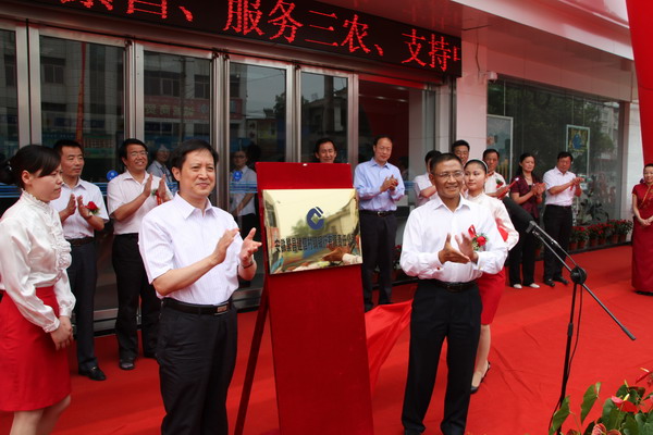 芜湖市副市长刘振华与建行投资理财总监毛裕民为安徽繁昌建信村镇银行揭牌。