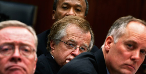 2008年12月9日,美国华盛顿特区,前房利美CEO丹尼尔·穆德(右)与前房地美CEO理查德·塞隆出席众议院监管和政府改革委员会举行的关于“两房”在金融危机中所扮演的角色的听证会。这次听证会就谁应为两大抵押贷款融资巨头房利美和房地美的崩溃及被政府接管一事负最大责任进行讨论。 CFP/图