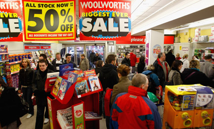 2008年12月11日,英国百年连锁零售商Woolworths于当地时间周四清仓处理,由于降价幅度很大,吸引了众多消费者前去购买,以应付这个经济危机的冬天。 CFP/图