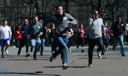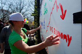 2009年3月31日,美国纽约,一位失业的编程人员为鼓舞士气,组织了一场“失业奥运会”,项目包括“都是老板的错”,“掷电话”和“失业办公室赛跑”。上图为一位失业女子在参加“都是老板的错”比赛。 CFP/图
