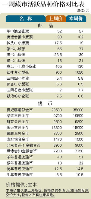 春节后的邮市表现炙热,伴随交易量的明显放大,老邮品种上涨波及面已扩大至1985─1991年小型张。一周来强势品种继续攀高,如庚申猴邮票扬升到6400元,牡丹小型张更是飙升到30000元附近,一周价格呈翻番之势。而近年来市场表现活跃的热点新邮品种也乘势反弹,其中小版张板块表现突出,2004年发行的小版张平均升幅在2成左右。币市也有所表现,其中彩金币走势趋强,如梅兰芳梁红玉黛玉夺魁盘古开天地猴王出世彩金币分别上扬到35000元、10500元、10200元、7800元和12000元。而纪念流通币中的生肖品种也在上扬,像羊年猴年牛年价格分别攀升到52元、25元和10元附近。
