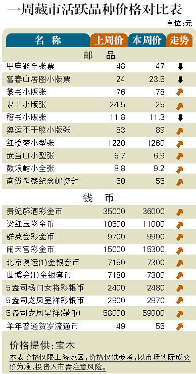 邮市方面:“庚申猴”邮票轻松突破7000元整数关,本周初创出7300元新高,“从小爱科学”和“红楼梦”小型张分别回升到13800元和1280元,“科学大会”小全张攀升到3600元。但新邮表现低迷,2009全年套票价格下跌至108元。