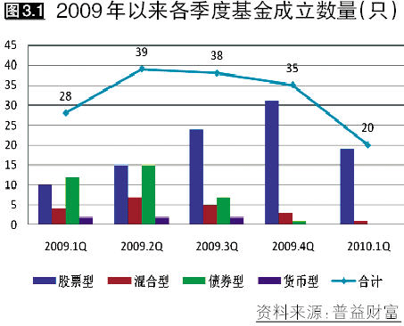 一季度共成立新基金20只,成立数量较2009年(以下称去年)的4个季度都要少。从今年一季度新成立基金的类型上看,共有19只股票基金(包括指数基金、QDII基金)和1只混合基金,股票基金成为绝对主导。债券基金与货币市场基金这类低风险品种始终处于停发状态,最近的7个月仅有1只债券基金发行。(图3.1)