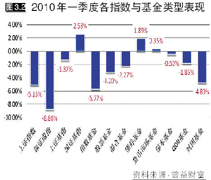 受股市影响,国内各类偏股型基金都只获得负收益,债券基金、货币市场基金等低风险品种表现更佳。(图3.2)