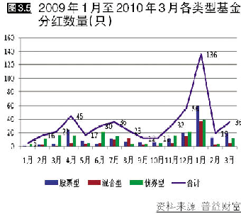 2009年10月份以来,分红基金数量持续攀升,到了2010年1月,分红基金数更是出现井喷,达到136只之多,超过了以往任何一个月,这也是创纪录的一次。2009年4月份基金分红新规(《证券投资基金收益分配条款的审核指引》)出台后,基金的分红逐渐走向规范化,本月的情况也是新规效果的体现;另外,整体来看2009年全年基金收益较为丰厚,在2010年1月市场调整之时让收益及时落袋为安符合投资者利益(1月股市的下跌也和基金减仓套现以用来分红有关,两者互相影响);再者,基金分红增加了基金吸引力,在1月基金销售较清淡的时期,分红也可为基金公司达到持续营销的目的。该月分红的股票基金为60只,混合基金37只,债券基金39只,无论同比还是环比都大幅增加。(图3.5)