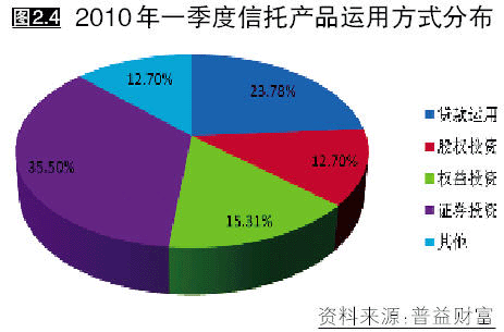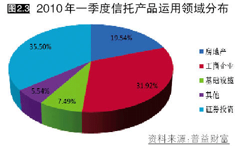 从运用领域角度看(图2.3),本季度证券投资、工商企业、房地产和基础设施领域产品的发行数量分别是109款、98款、60款和23款。前两大领域的产品分别较上季度增加45款和5款,而后两领域产品分别下降12款和4款。共有28家信托公司参与了房地产领域产品的发行。