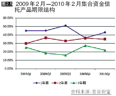 从新发产品的期限分布看(图2.5),本季度一年期、两年期及三年期产品占比分别是42.87%、35.11%、22.02%。如图所示,2009年以来,一年期产品持续占集合资金信托的最大比重,在2009年四季度其占比波动下滑后,本季度又有所回升,占比超过40%。