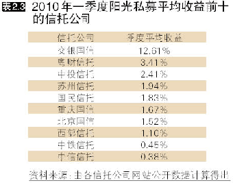 在普益财富统计范围内,2010年一季度共有30家信托公司旗下有阳光私募产品运行,且各公司产品业绩表现跨栏不一。其中,包括交银国信、粤财信托在内的13家信托公司平均取得正收益,剩余17家公司均出现不同程度亏损。受“中咨东方二号”高收益影响,交银国信以单季12.61%的收益稳居榜首,远超其他信托机构。(表2.3)
