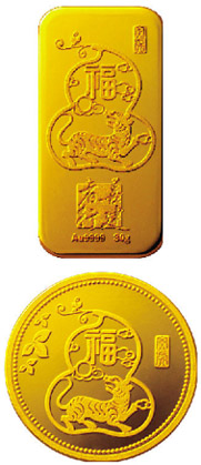 卧虎迎春彩金金条:30克、50克、100克和200克
