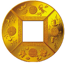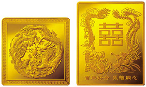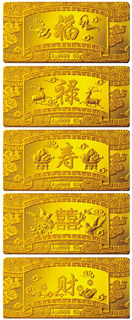 以“福”、“禄”、“寿”、“禧”四字为设计主题,全套4枚产品拼在一起呈现方孔金钱图案,称之为“财”。