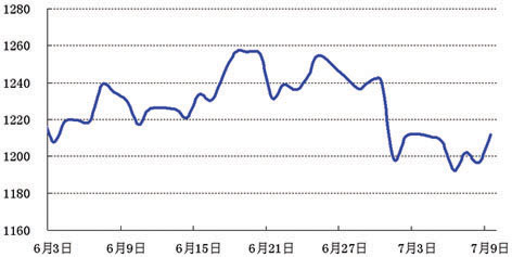 投资者看好经济前景,NYMEX-8月原油合约较前一周上涨5.5%;现货黄金价格一度跌穿每盎司1200美元,之后略有反弹,报收于每盎司1211.5美元。