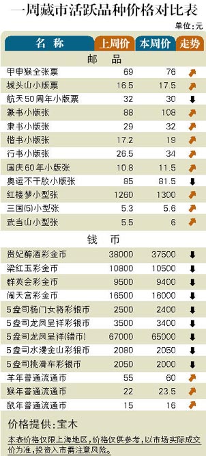 邮市方面:2003年小版张的扬升步法势不可挡,近一周的升幅这次加快,其中古桥小版张走高到400元,而崆峒山毛泽东聊斋(3百合花小版张分别攀高至205元、108元、110元和128元。此外,己丑牛全张票飙升到62元,一周涨幅高达88%。币市方面:庚寅虎”5盎司彩银币在12500元整固,深圳特区金银套币回落到3850元。而第三版人民币中的红一角券扬升到4300元。