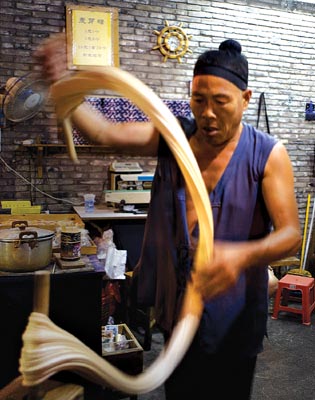 到杭州游玩的朋友一定不会放过到宋城的机会,特别是逛这里的夜市,一进到这里仿佛回到了远古的宋代,所有的小商小贩、做小买卖的、耍手艺的、耍把式等各种表演均为宋代的装束。看到一位用传统工艺做麦芽糖的铺子,吸引了我的脚步,这位老人边吆喝,边操作,一会儿把那麦芽糖拉的长长的,一会儿把它迅速缠绕起来,拧上几圈再拉,看上去很费力气,工艺和装束太有意思了……谢有福/图文