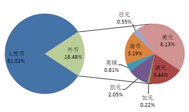 本季度发行的理财产品币种包括人民币、美元、港币、澳元、欧元、英镑、加元以及日元等。人民币产品共发行2227款,环比减少163款,市场占比为81.52%,较上一季度有所下降。外币理财产品505款,环比增加108款,市场占比由14.24%上升至18.48%。外币产品中,美元产品继续增长,共发行222款,环比增加27款,市场占比为8.13%;澳元产品共发行94款,环比增加13款,市场占比为3.44%;港币产品90款,环比增加31款,市场占比为3.29%;欧元产品56款,环比增加5款,市场占比为2.05%;英镑产品22款,环比增加16款,市场占比为0.81%。加元产品6款,与上一季度基本持平。日元产品在时隔两年后于8月份出现,均为交通银行所发行,主要是受到近期日元升值影响,使得市场对日元产品的关注度再次上升。