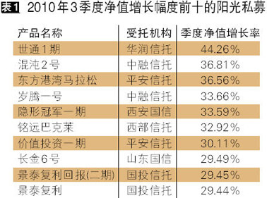 从单款产品看,华润信托与南京世通资产管理有限公司合作推出的——“深国投·世通1期证券投资集合资金信托计划44.26%的收益位居本季榜首。中融信托的“?中融-混沌2号证券投资集合资金信托计划和平安信托的平安·东方港湾马拉松集合资金信托计划分别以36.81%36.56%的净值增长率分列二、三位。(表1