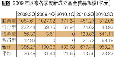虽然本季度成立数量环比有所减少,但募集规模却显著增长,953.27亿元,环比增长40.72%,同比减少31.24%;平均规模23.83亿元,环比增长75.90%,同比减少34.67%。从募集规模,特别是平均规模可以看出,本季度投资者投资基金的热情大涨,但仍不足2009年下半年股票市整体向好带动的热情。从具体类型看,23只股票基金共募集人民币312.05亿元,平均每只募集13.57亿元,较上月增加2.29亿元左右;1只混合基金募集40.93亿元,较上月的平均规模增加3.62亿元;14只债券基金共募集541.11亿元,平均募集38.65亿元,较上月增加17.01亿元,2只货币基金共募集59.18亿元,平均募集29.59亿元,较上月增加18.73亿元。债券基金与货币基金的平均募集规模发行量大幅增加反映本季度二者深受投资者追捧。