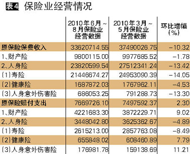 本季度各险种保费收入均有所下滑,20106月~8月(截稿时官方数据仅更新至20108月,因此选取20106月~8月这三个月作为一个统计季度)保险业保费收入较上一个季度下降10.32%,下降幅度较大。不过,本季度原保险赔付支出却略有增长,增幅为2.30%。(表4)
