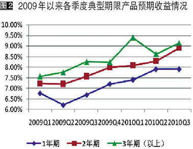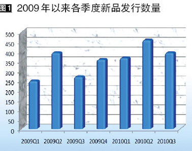 2010年第3季度(以下简称本季度)共有48家信托公司发行394款新品,同比下降14.16%,环比上涨45.93%(由于信托产品信息披露的时滞性,本季度最终的新品数量可能远高于394款)。其中,中融信托以48款产品的发行数蝉联榜首,紧随其后的是中信信托和中铁信托,分别发行24款和23款。(图1