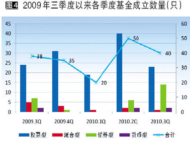 本季度共成立新基金40只,环比减少10只,减幅为20%;同比增加2只,增幅为5.26%。二季度基金成立数量大幅回升的原因之一系当时逢股票市场全线下跌行情,监管层有为市场输血的意图。然而,而本季度股票市场沪度结束了下跌趋势,总体有所回升,证指数收于上涨10.73%,深成指上涨22.18%,减弱了监管层的输血意图,基金成立数量在这种背景下有所回落实属正常。