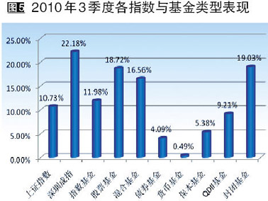 受益于各标的市场的上扬,本季度各类型基金均走红,偏股基的表现尤为明显:封闭式基金以19.03%的净值增长率遥遥领先于其它类型基金,其中表现最好的是基金景福,增长率高达29.58%,表现最差的则是基金汉兴,增长率为10.83%;开放式股票基金不仅总体走红,净值平均增长18.72%,而且所有股票基金均实现了正收益,东吴行业以35.32%的收益率位居业绩榜首,而宝盈泛沿海虽然获得3.4%的收益,但依然没有摆脱表现最差的命运;开放式混合型基金表现优于大盘与指数基金,增长率为16.56%,领先同期上证指数5.83个百分点,其中表现最好的是大成2020生命周期,增长率为30.76%,而表现最差的是泰达宏利风险预算混合,仅获得2.47%的收益。