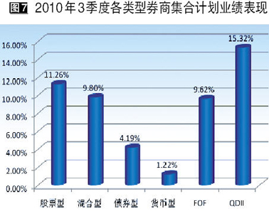 同样受益于各标的市场的表现,本季度各类券商集合产品均全线收红。其中,股票型券商集合产品的净值平均增长11.26%,低于公募股票基金近7.5个百分点。其中,中信聚宝盆C—中信优选成长以19.22%的增长率位居榜首。披露的二季报显示,因二季度股票市场大幅走低,该产品股票仓位由一季末的83.07%调低至55.68%,减少逾30个百分点。而本季度股票市场总体向好,其中上证指数从本季初的2300余点上行至季未的近2600点,虽然三季报尚未公布,但19.22%的佳绩告诉我们,中信聚宝盘C又根据市场环境进行了适度加仓。