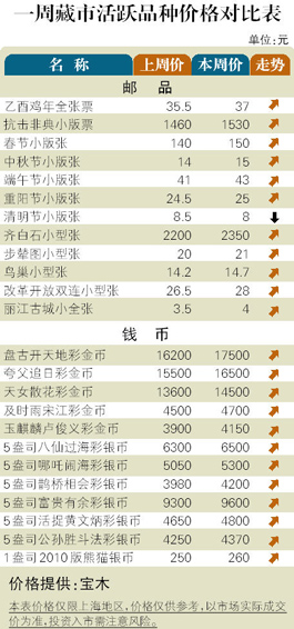 邮市方面:新邮盘桓格局延续,但老邮热点显露。其中字邮票和编号邮票上扬,整部价格分别攀升到125000元和16200元。JT票中的一轮生肖全张票继续飘红,像癸亥猪乙丑牛丁卯兔戊辰龙全张票分别走高到8200元、600元、360元和870元。币市方面:辛卯兔金银币依然是市场交易热点,其中本色金银币和彩金银币分别顺延到3700元和5700元,而5盎司兔年彩银币价格飙升至20000元附近,造成同规格的虎年彩银币暴涨到29000元。