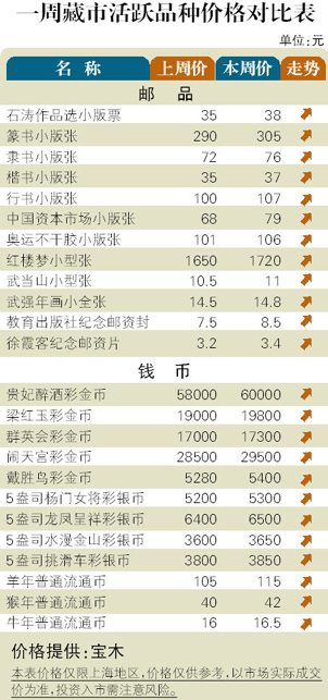 新年伊始,藏市表现较为温和,近期邮品依然是热点所在,不少品种价格呈回升之势,而金银币随着国际金价突破创新高,也现反弹表现,市场成交活跃。邮市:因1月5日发行“辛卯兔”邮票,因此新邮中的生肖版张表现突出,如“甲申猴”、“乙酉鸡”、“己丑牛”和“庚寅虎”全张票分别攀升到152元、69元、128元和64元。币市:金银币有所回升,其中“湘云醉眠”、“天女散花”、“猴王出世”和“及时雨宋江”彩金币分别微涨到19200元、14800元、22700元和4700元,但“辛卯兔”抛压较重,特别是彩金银套币价格回调至5100元附近,5盎司彩银币下滑到14300元。