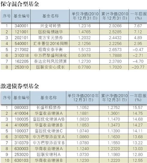 在所有保守型混合基金中,本月涨幅第一被兴全可转债夺得,该基金全月净值上涨1.33%;国联安安心成长则成为了本月垫底,净值下跌了8.25%12月份的排行与全年排行大同小异,兴全可转债以7.67%的涨幅夺得本年度的涨幅头名;长期以来经常出现在涨幅榜垫底位置的国联安安心成长则毫无悬念的成为2010年最不具投资价值的保守型基金,其年度跌幅达20.77%