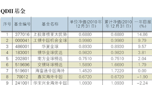 本月,国际大宗商品价格上扬,全球股市呈波动震荡走势。截至1231,香港恒生指数收盘报23035.45点,微涨0.12%;美国道琼斯工业指数微跌3.30%,报收于11577.51点,上涨5.19%。招商全球资源受本月国际大宗商品市场价格上涨的利好,月净值涨幅达7.99%;嘉实H股则受到港股表现疲软的拖累,本月净值下挫3.04%,排名垫底。上投摩根亚太优势则以14.86%的涨幅成为2010年度表现最佳的QDII;华宝兴业海外中国则出现了2.04%的跌幅,不幸垫底。(雷雨)