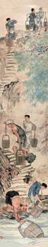 作品描绘了当时重庆人民一个极平常的生活场景——汲水,当时百姓每日生活用水,都要从江中汲取,故而无论男女,为了生计,每天都要到江边取水。他们挑着沉重的木桶,再装上满满的水,沿着崎岖陡峭的山路走回家去,有时甚至要往返多次。正是这样一个再平常不过的生活画面,触动了艺术家的心灵。画家以整合西洋画法的丰富艺术表现,将蜀地人民传统汲水的宏大场面,分解为舀水、让路、登高前行3个段落,描绘男女老幼不同动作的7个人物。画面颇显细高。但其悬挂起来,确与嘉陵江的百丈悬崖相一致,凸显场景的陡峭、惊险。