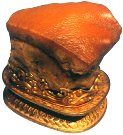 众所周知,台北故宫有块疯狂的石头。此物肥瘦分明、肌理清晰、毛孔宛然,俨然一块东坡肉,它的本尊却是一块玛瑙石。此类矿物在大自然中,由于经过漫长岁月的累积,在不同的时间点,杂质影响乃至生成的颜色不同,呈现了一层一层不同的色泽。工匠想是灵机一动,将原来质感丰富的石材加工琢磨,并将表面的石皮染色,做成了这块,可谓肉石本天成,妙手偶得之。在台北故宫陈列室中,肉形石与翠玉白菜是人气最旺的两大文物,经常摆在一块供参观欣赏。
