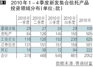 “通知”不仅要求各信托公司对房地产信托业务进行自查,而且要求各地银监局对辖内信托公司的房地产信托业务进行逐笔核查,尤其是对于以股权投资方式向开发商提供资金的业务,要按照实质重于形式的原则予以甄别,在即将开始的净资本计算中,此类业务或许会占用信托公司更多的资本金。受此《通知》的影响,房地产信托产品的发行量有所放缓,部分信托公司或考虑到自身的风险或在监管部门的要求下,甚至暂停了该类业务。(表1)