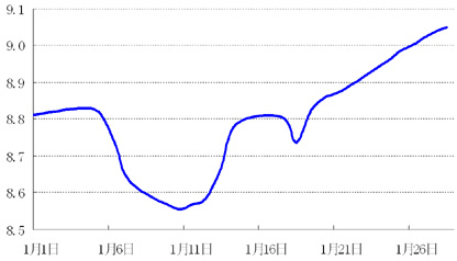 上周美国四季度GDP为3.2%,略逊于市场预期3.5%,但仍显示该国经济正步入稳步复苏阶段,尤其是经济增长动力转向私人部门,库存对经济贡献度下降,显示经济增长质量好转。但美元走势与经济数据关系不大,突尼斯和埃及动乱升级,导致避险买盘大举建仓,美元强势反弹。美元指数本周交投区间在77.60~78.50,收于78.15。欧元上周涨势趋缓,周五突如其来的动乱升级,导致欧元大跌,吞噬本周前期所有涨幅。欧元本周交投区间1.3537~1.3758,收于1.3610。日元受评级机构调降日本主权债务评级影响,周四大跌,但仅仅维持一天后因避险买盘买入影响大涨。日元本周交投区间在81.95~83.21,收于82.11