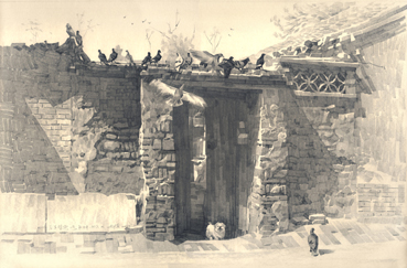 这条胡同已经太沧桑了,也是13幅画里面最矮、最破的一个胡同,后来这个院子被直接拆掉了。加之画得又是冬天的时候,整个画面显得特别荒凉。所以必须加一些东西来活跃氛围。这个胡同很矮很小,如果加的东西过大的话,会感觉很压抑,所以只能加些小事物,也就是添加鸽子和小狗来活跃气氛。鸽子取材于奥体东门那一块,那天拍了一天的鸽子。花掉八卷胶卷。在门框上站了一整排鸽子来活跃气氛,也有人质疑鸽子会不会加的太多了。小狗也是“移植”过来的。其实这只小狗是我很多幅作品里的“模特”,这里面有个故事。
