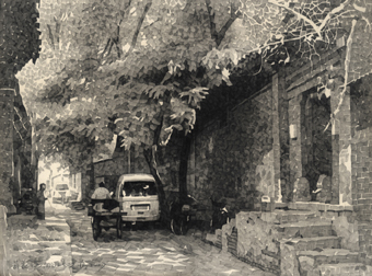 这幅画的树很多,素材取材于夏天。我也没有偏爱哪个季节,就是拿到素材的时候机动选择,之前并不考虑这个问题。这两棵树我也很喜欢,它的起伏、层次都非常好,很婀娜、疏密有致,和什锦花园胡同的那几棵有不同的优美。我在树木的地方做了加法,把树冠画的比原来大,树叶也较之更繁茂一些,叶片更大一些。我喜欢树是因为每棵树都有自己的样子和性格,有些硬朗、有些优雅、有些软弱。每棵树都能活出自己的生命和价值。这幅画除了树,在留人还是留车方面做了二选一的选择。原本右侧院门口有好几个光膀子的男子,我就全把他们给删了,因为构图上会挡住面包车,当时黄面包已经消失了,所以觉得留住面包车会更具有历史意义。但后来想想,光膀子的老爷们也挺北京的,所以有时候也会后悔当时冲动给删了。一年前我去过这个胡同,现在这个车后面的部分已经都拆完了。