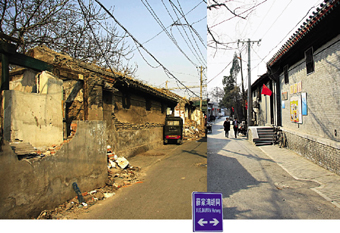 201011—— 一块标示牌,将这条胡同分成了两个截然不同的世界,一边青砖灰瓦,整齐划一;一边则是断壁残垣,破败不堪。余江灏/摄