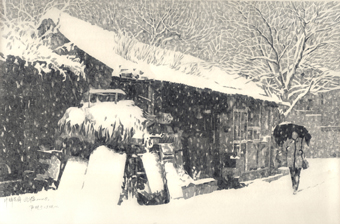 这是两幅雪景胡同中的一幅,但是这幅是以树为主的。你看冬天的树木都光秃秃的,但是雪落在上面就很漂亮,有不一样的味道。白雪覆盖下的枝干脉络非常清晰,也非常优美。还是那句话,喜欢树是因为它的生存形态绝对没有一样的,每棵树的形态都有其独特之处。每个季节的树都是不一样的,冬天是灰的或者白的,春天是嫩黄嫩黄的,夏天是翠绿的,秋天是黄绿相间或者渐变的。这些都是可以从铅笔下感知的——叶子的疏密、深浅、阴影薄厚。不管是在北京,还是在老家,我们老家有一颗樟树的直径比10平米的屋子还要大,我都愿意盯着树看半天,所以我也很愿意在我的作品里表现出来。但现在的建筑结构都违反了历史客观规律——先建房子后植树,应该是先栽树后建房子。你看以前的村庄,其实差不多都在大树底下盖房子建院子。我以前挨个村去放电影,肯定是有大树的地方就有村庄。