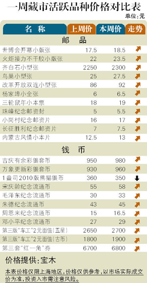 邮市强势延续,热点增加,过去一周双连小型张成新亮点。而金银币也呈企稳之态,部分银币上涨。邮市:“甲申猴”全张票本周初从800元回落至720元附近,终于停顿了连续月余的上扬步伐。双连小型张突破,“洛阳世展”、“改革开放”和“世博会”分别创出110元、96元和70元新高。此外,JT后期(1985─1991)小型张成交渐增,“三国(1)”和“西湖”攀升至170元和20.8元。币市:“京剧脸谱”第一组和第二组彩金银套币攀升到9100元和7850元,“上海造币厂”和“农行上市”熊猫加字金银套币上扬至7800元和3900元,而“创业板”和“资本市场”熊猫加字银币走高到1450元和950元。