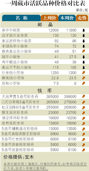 8月中旬藏市表现活跃,邮市中的产品票继续逞强,而近期热点新邮振荡加剧。金银币部分强势品种价格缓步攀升,似在摆脱歇夏桎梏。邮市:第三轮生肖版张振荡幅度再度放大,像甲申猴全张票的价格在570-760元之间宽幅波动,总体看该板块在过去一周价格呈下降之态,调整意犹未尽。戊辰龙邮票创出20元新高,而2006年发行的早期领导人和谐铁路套票收购价臻至100元。币市:伴随着黄金价格上扬,金银币成交渐渐活跃。其中贵妃醉酒彩金币创出7万元新高,新面世的清华大学金银套币则大幅高开在1.2万元附近。