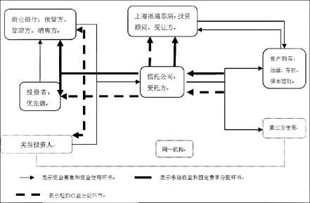 其次,承诺收益和固定费率分配环节,期末投资产品全部售出或由受让方受让,则依次支付受托人0.8%的信托费,产品保管人、管理人、销售人(商业银行)1.7%三费(保管费、管理费、销售费)之和,顾问方1%的投资顾问费,使用方1.5%的投资运营费用,优先级投资者本金和6%的承诺收益,次级投资者本金和6%的承诺收益。