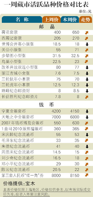 9月中藏市冷热不均,邮市继续成为老邮舞台,新邮阴跌不止。金银币市场重陷盘旋,但价格波动幅度有限。邮市:以JT板块为主的老邮继续逞强,创新高品种均系前期滞涨对象。如留园山茶花民族乐器戒烟柯棣华等套票扬升到660元、265元、280元、110元和23元历史高位。此外,本周新邮总体下挫,惟新发行的关公高开高走。币市:金银币交易量继续萎缩,近期新品仍在回调,清华大学金银套币回落到10300元,京剧脸谱(2金银套币微挫至8400元。不过2007钱币博览会银币价格升至650元,一个月涨幅达20%。