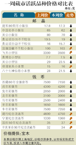 国庆期间,藏市表现较为温和,老邮俏、新邮滞的状态并未改观,而金银币下调走势延续。邮市:JT中的齐白石套票在1050元整固,但其他品种则继续走强,如猛禽徐霞客分别在50元和48元成交,古钱币(1畜牧牛梅花鹿兵马俑套票分别上扬到150元、90元、92元和43元。近期新发行的关公辛亥革命小型张均现大幅高开,短期风险毕露,而八十七神仙卷小本票在10天内已下挫40%。币市:金银币回调格局未见回转,成交也凝滞。而前两年炙手可热的第四版人民币抛压沉重。