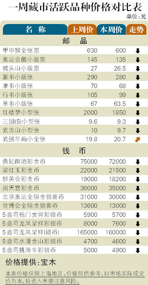 延续1个多月的邮币市场调整,到10月末仍无结束的征兆,而造成藏市萎靡不振的原因主要是近期新品频发,短线扩容压力令投资者谨慎的影响显而易见。邮市:2003年以来发行的新邮似跌跌不休,尽管下挫幅度在收敛,但阴跌之态却未扭转。本周甲申猴全张票再度跌破600元整数关,洛阳世展双连小型张也回调至100元附近,而10月份发行的美好家园辛亥革命小型张分别下滑到4.7元和8元,其中前者已跌破6元面值。JT 板块表现温和,大多数品种处于盘旋中,但成交量依然没有放大迹象。币市:金银币的成交捉襟见肘,绝大多数品种买卖差价有所增大,显示市场进一步调整的可能性增大,如贵妃醉酒彩金币的买卖价格分别为68000元和75000元,差价近1成。