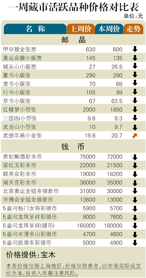 11月上旬,藏市略显企稳,但市场热点仍然屈指可数,投资买盘并不积极,观望情绪没有实质性的改善。邮市:近期热点品种构筑阶段性底部的征兆日趋明显,其中“甲申猴”全张票回升到630元附近,“洛阳世展”双连小型张继续在100元附近整固。币市:金银币出现止跌,但成交依然不畅,其因得益于上周国际金银价格的回升。其中“京剧脸谱”金银套币第一组和第二组价格分别微涨到8800元和7800元,而“贵妃醉酒”彩金币小升至73000元。