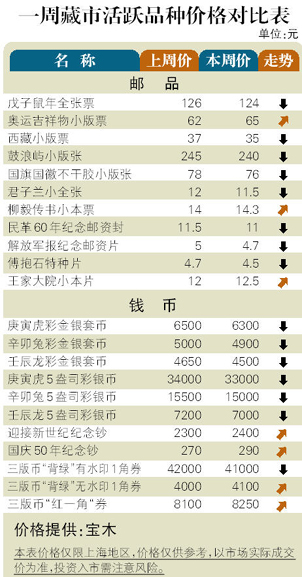 时至岁末,藏市整体走势依然颓萎,成交继续萎缩,热点品种价格下滑,市场人气变得散淡。邮市:强势品种阴跌格局延续,如“甲申猴”全张票滑落到600元附近,双联小型张中的“邮联六大”和“改革开放”分别下挫至31元和53元,“儒林外史”小版张跌到19元,不过“富春山居图”小版票突破百元整数关,攀至104元新高。币市:新品的接踵而至和国际金银价格的下滑,令弱势的金银币市场雪上加霜。其中“水浒”第三组彩金银套币下滑到1250元,5盎司“燕青智扑擎天柱”彩银币跌至4300元,而“壬辰龙”5盎司彩银币下跌到6800元,2011版“熊猫”1盎司银币回落至255元。